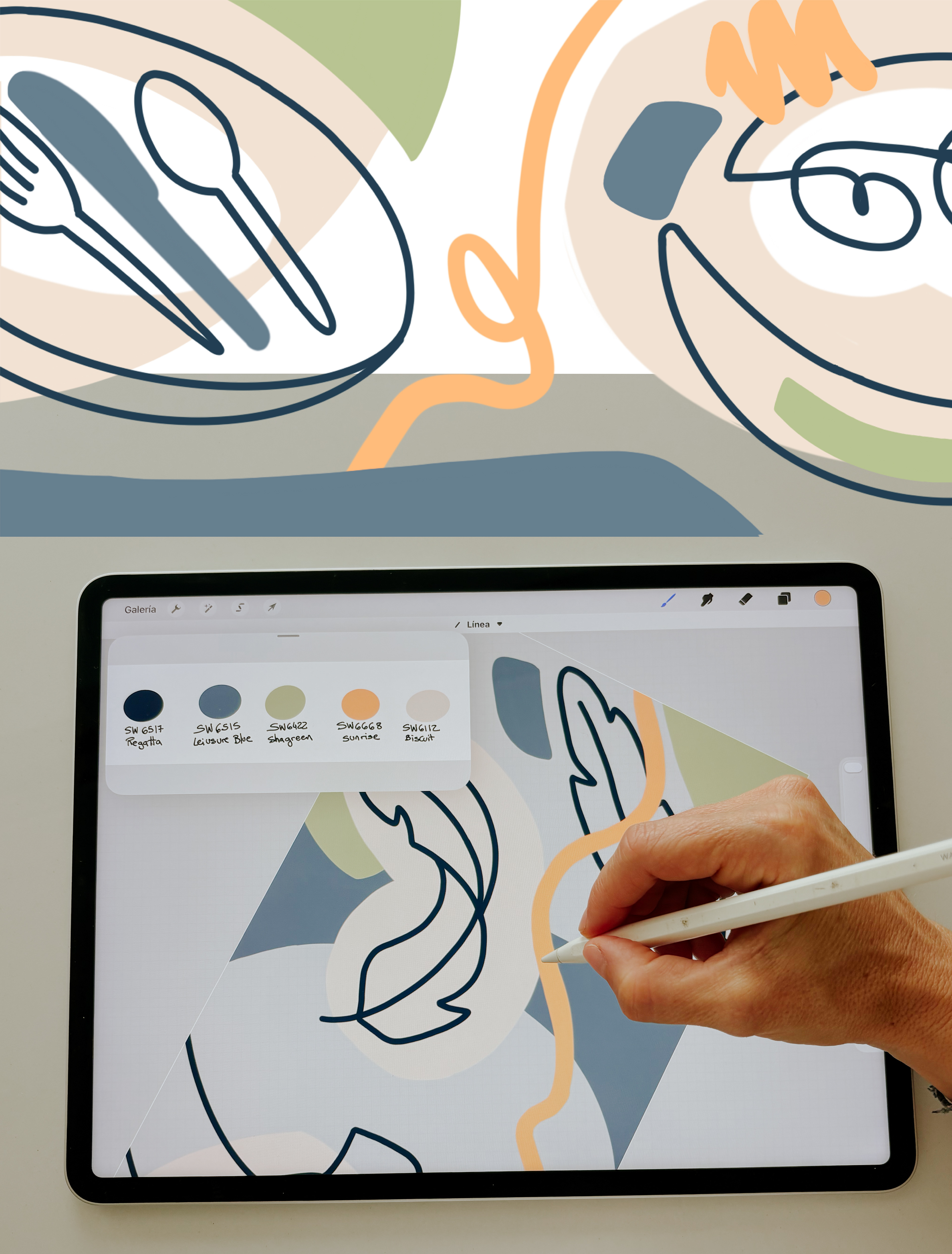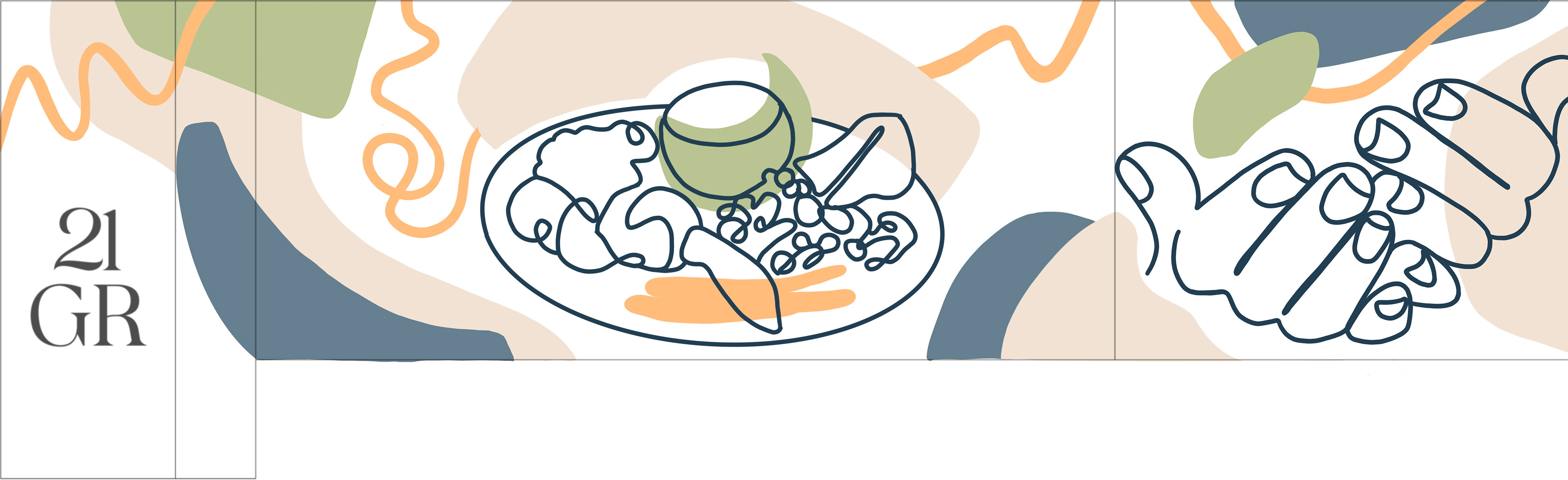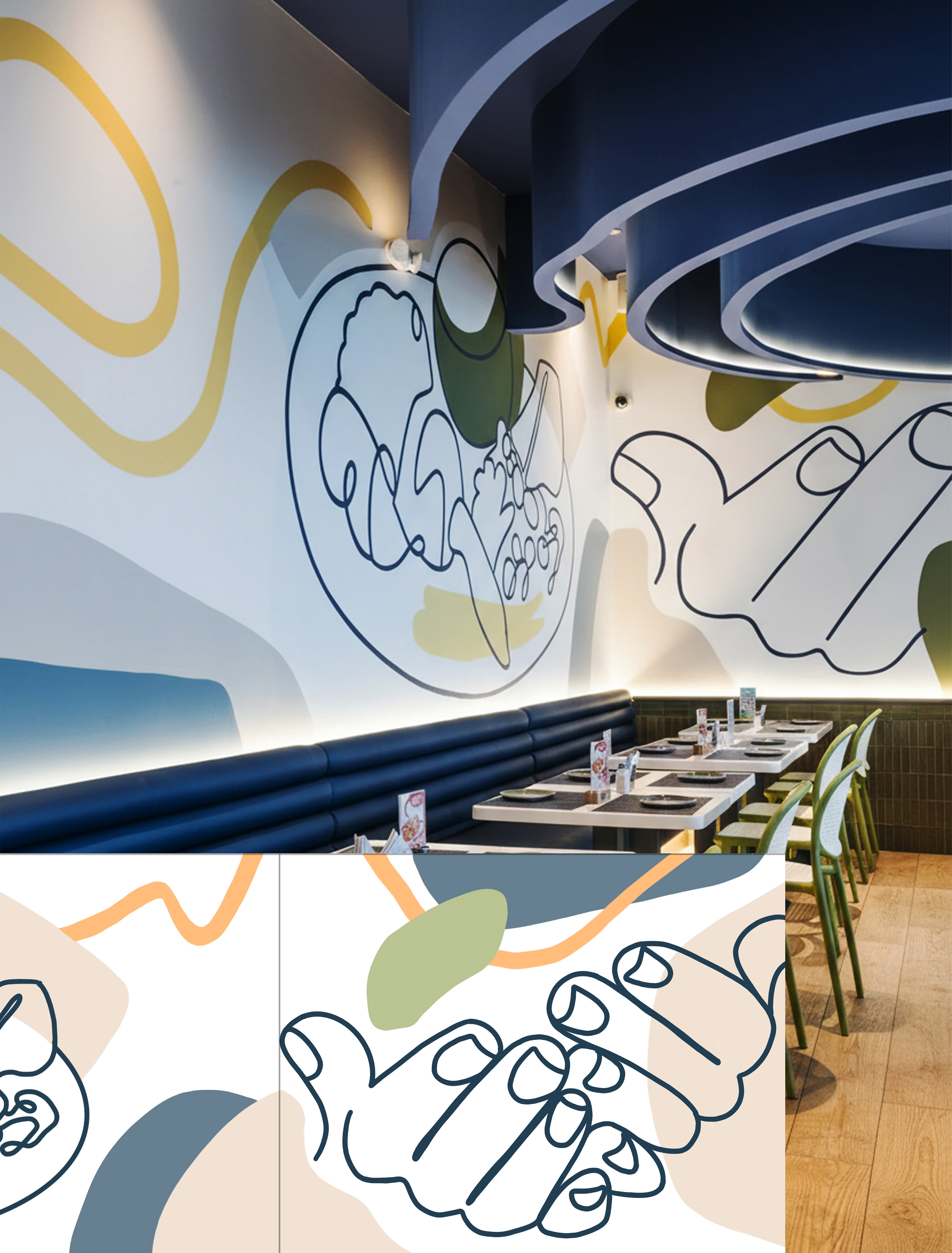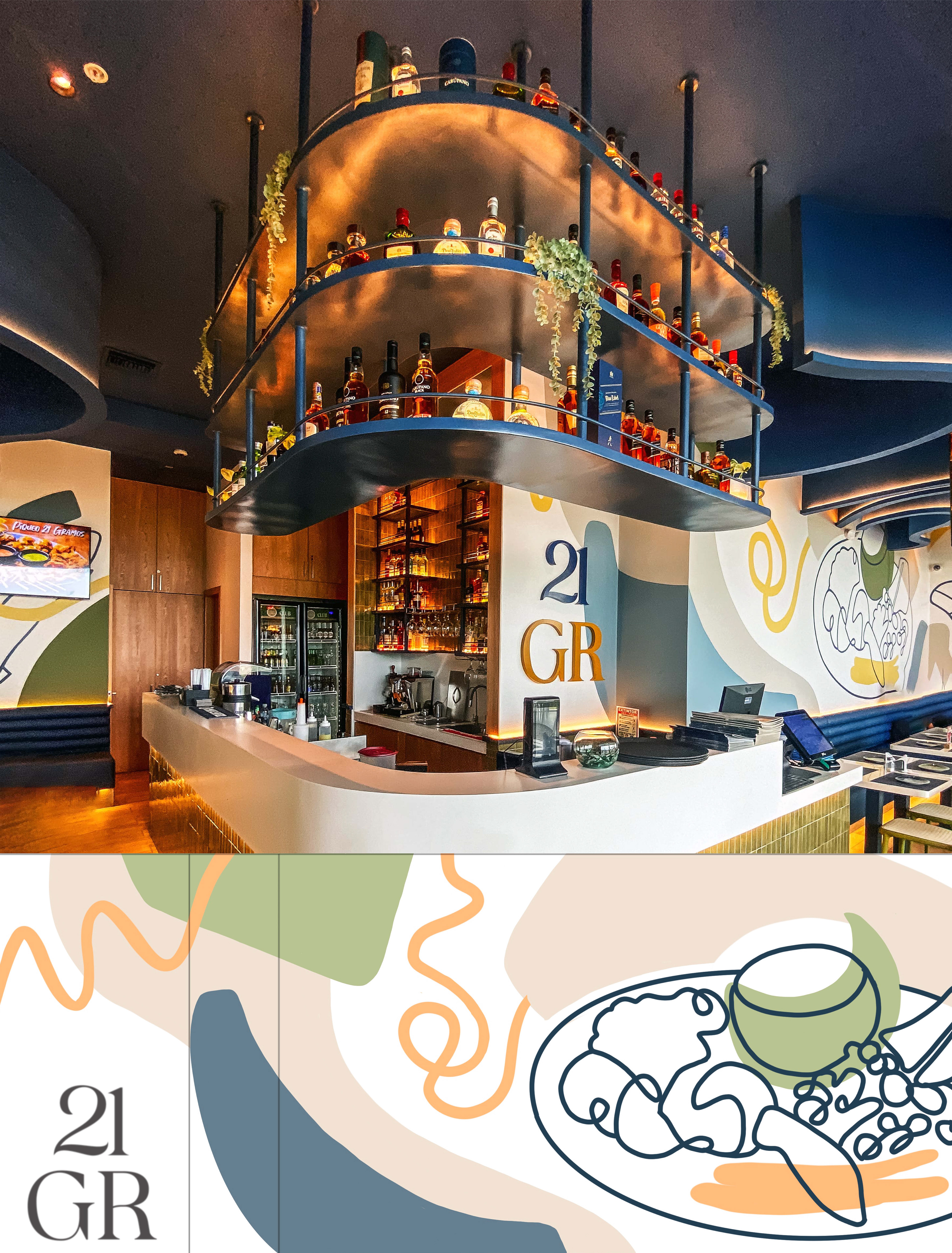 Realización de diseños originales, a medida, para ser aplicados como murales en el local gastronómico 21 Gr en Guayaquil, Ecuador. Diseño de 2 piezas para 2 secciones del local, bajo un mismo lenguaje visual, inspirado en elementos gráficos de la marca.