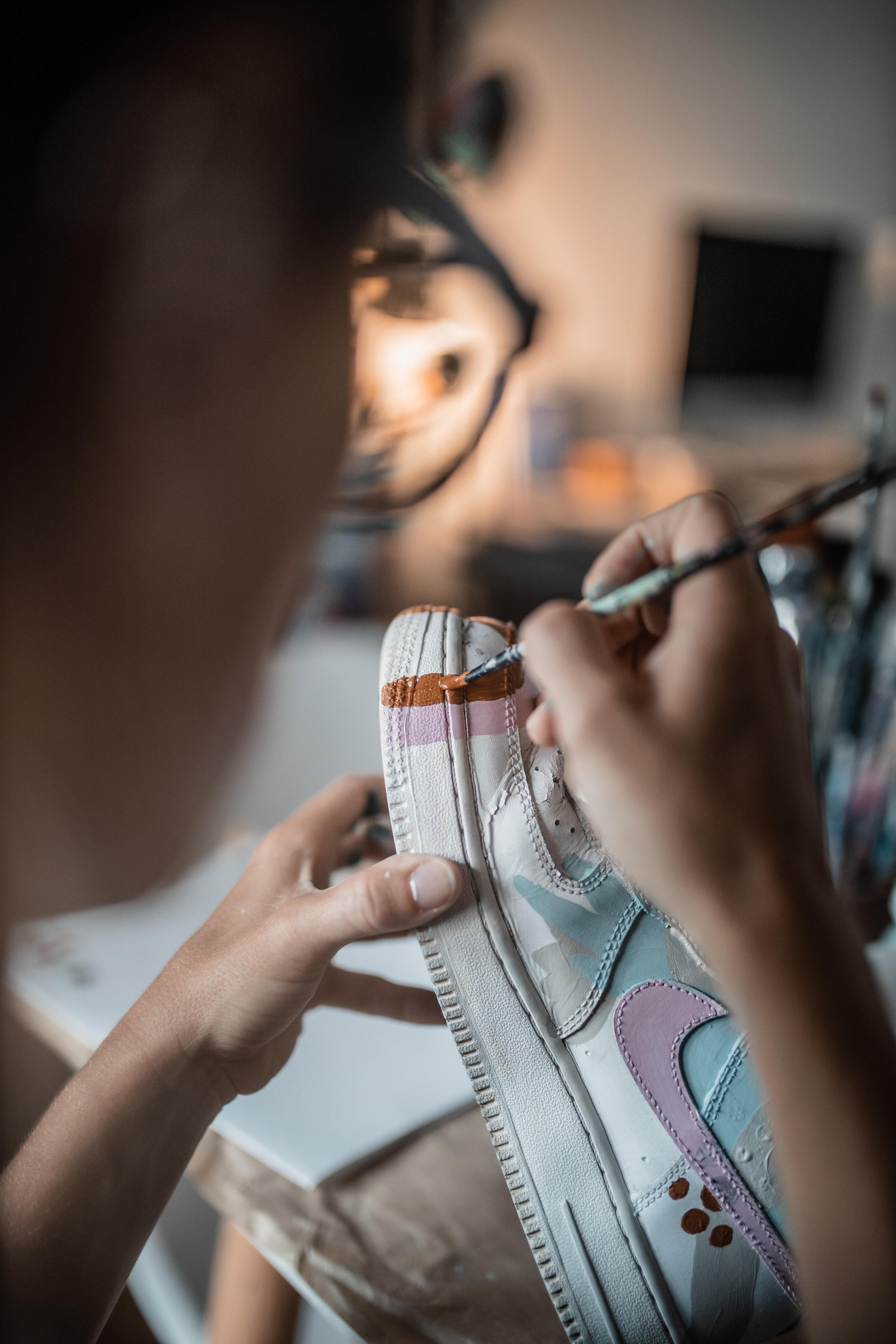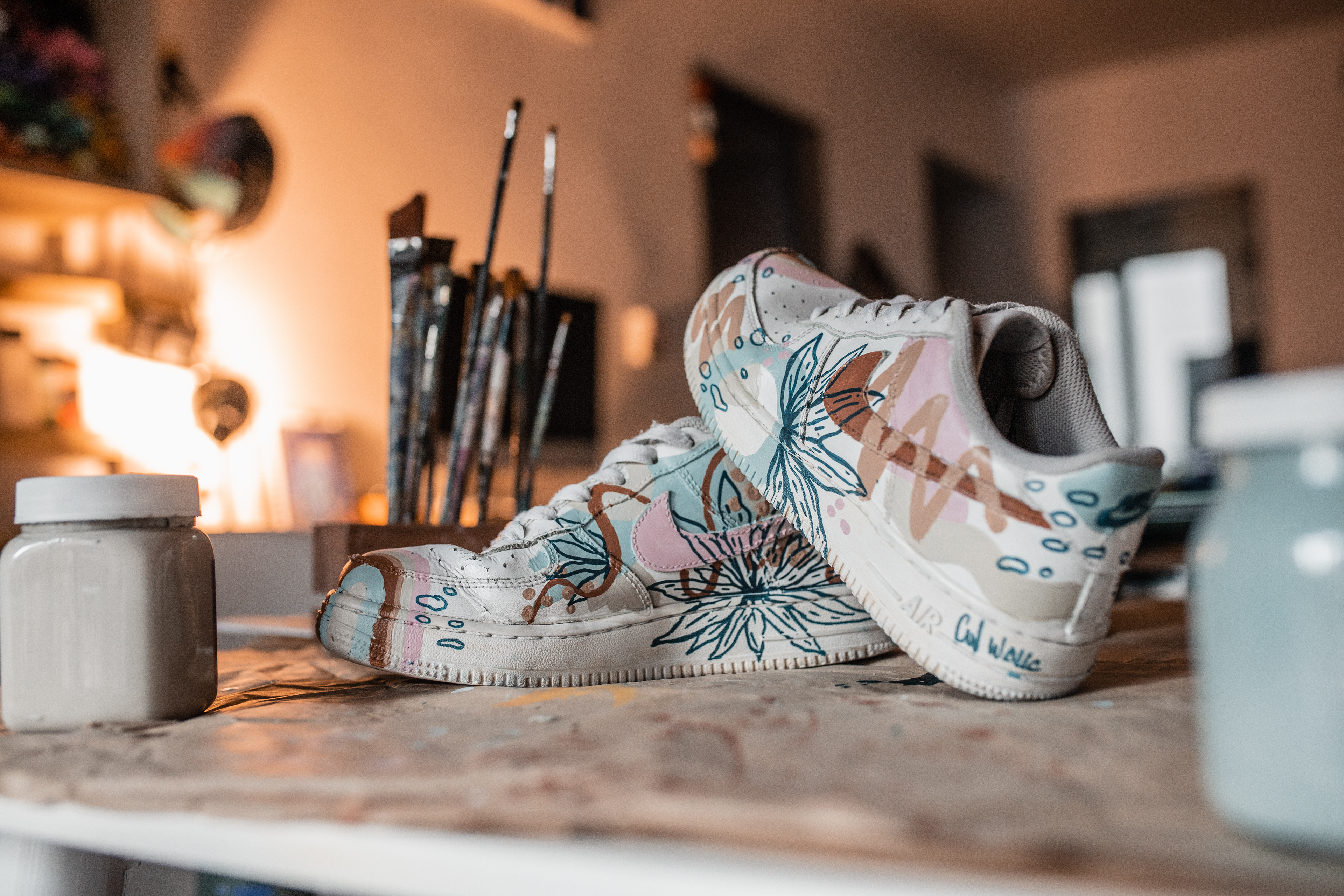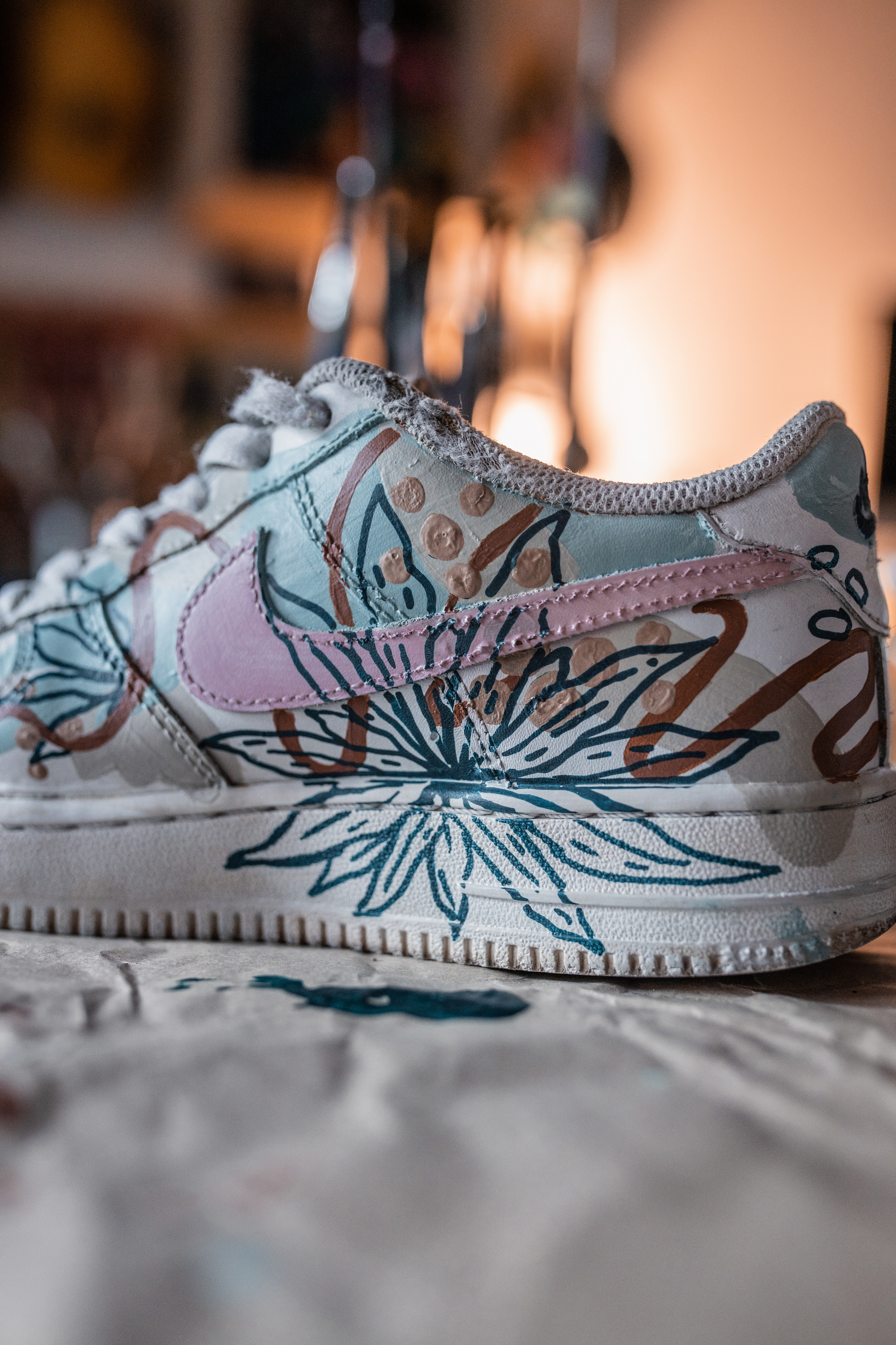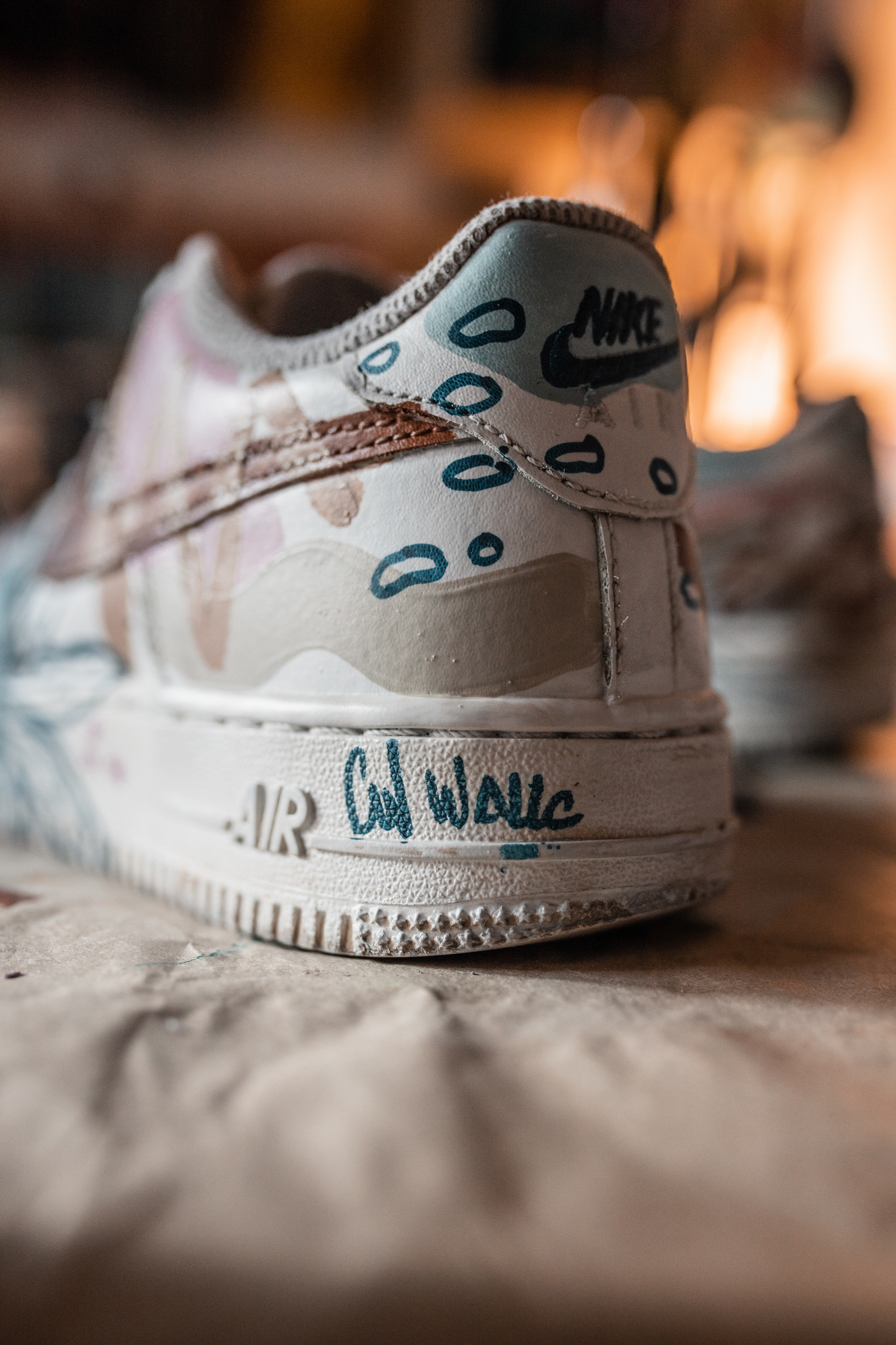 PAR DE ZAPATILLAS AF 1 INTERVENIDAS A PEDIDO, DISEÑADAS EN EL MOMENTO, CON PALETA DE COLORES "TIERRA" A PEDIDO DE SU DUEÑA.