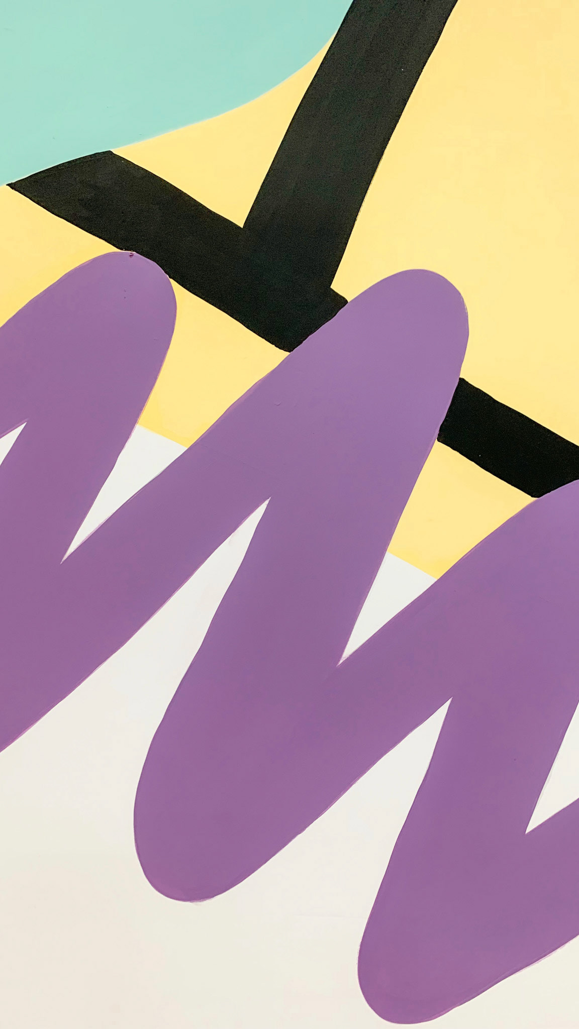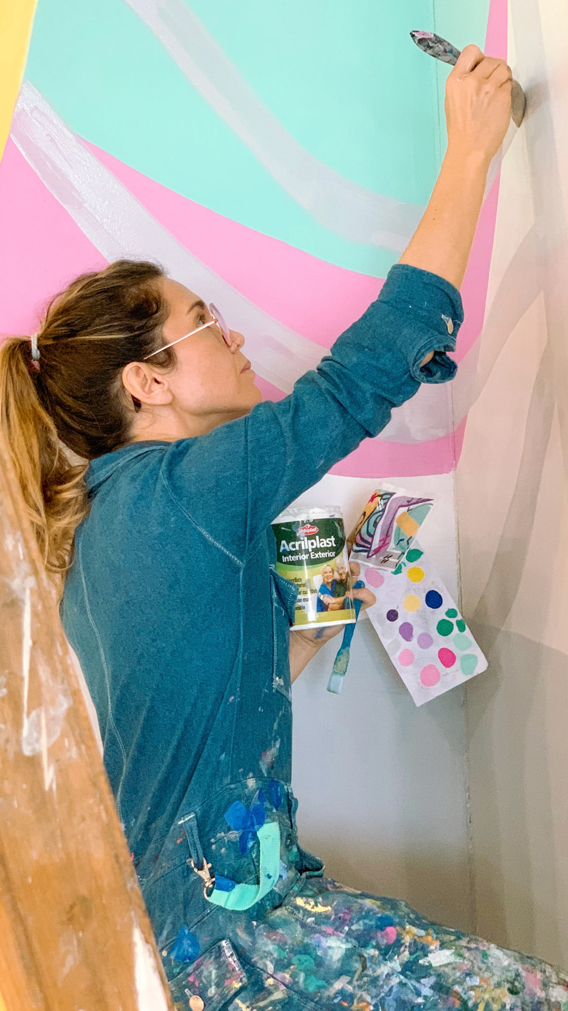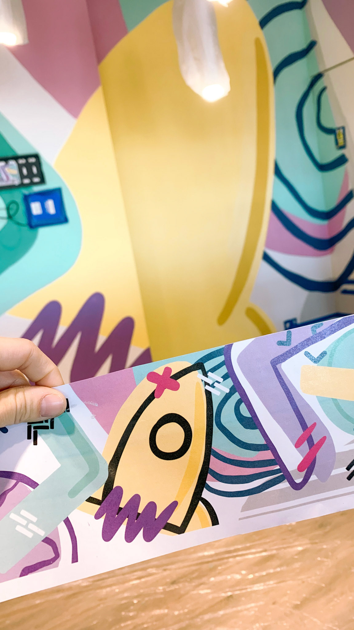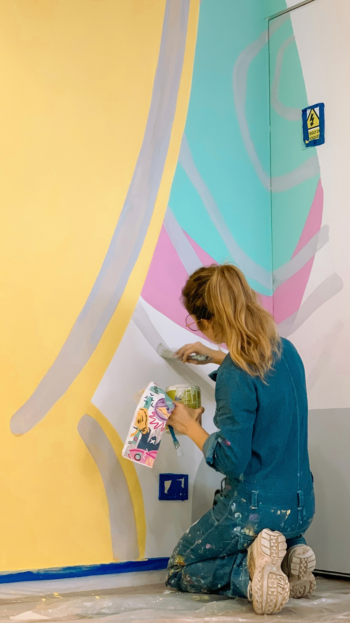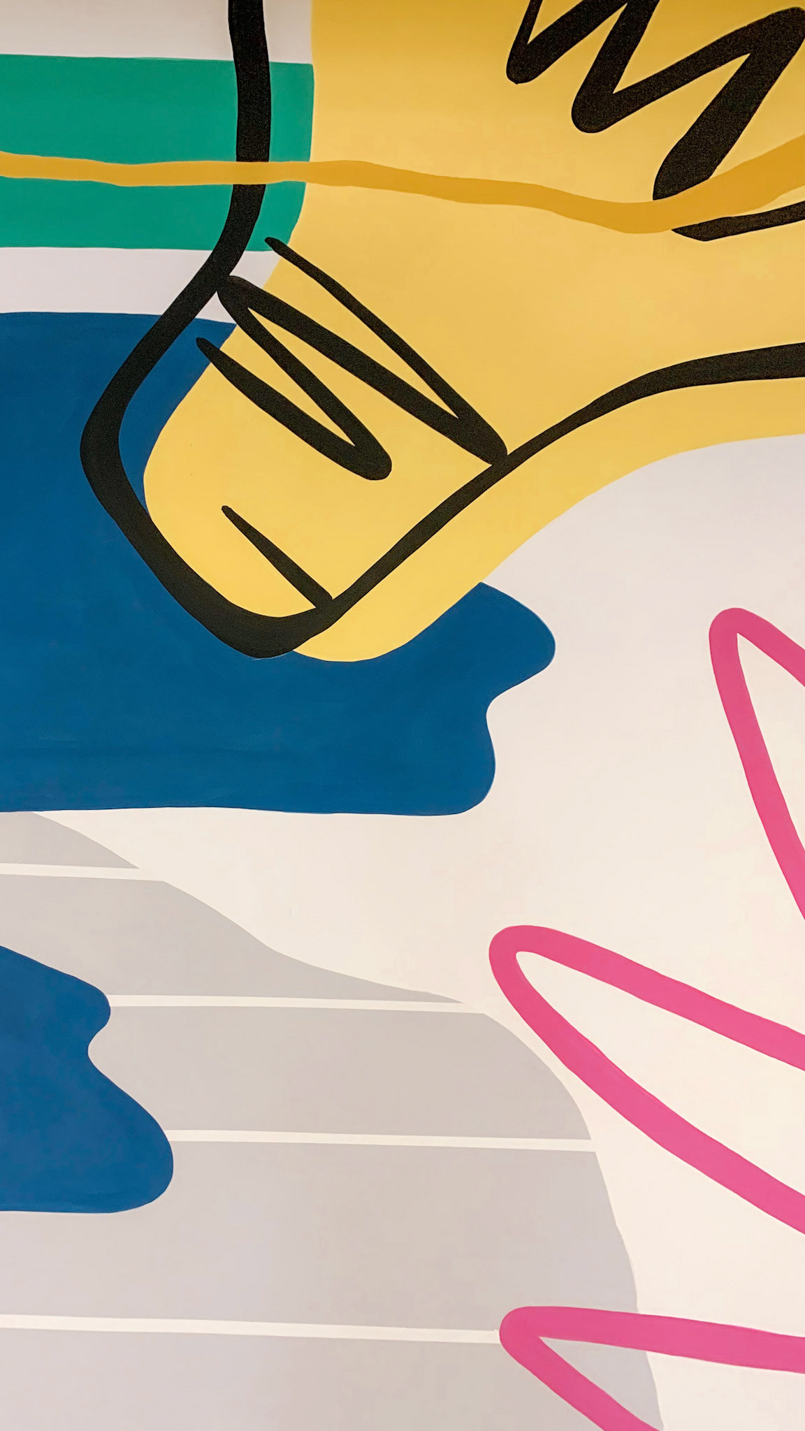 Mural en espacio de recreación de oficinas. Diseño original trabajado sobre la paleta de colores y elementos del branding empresarial.