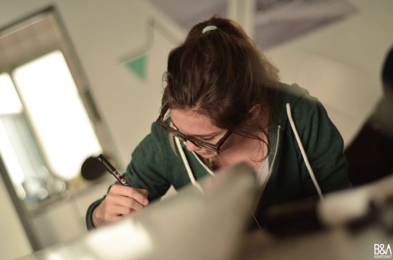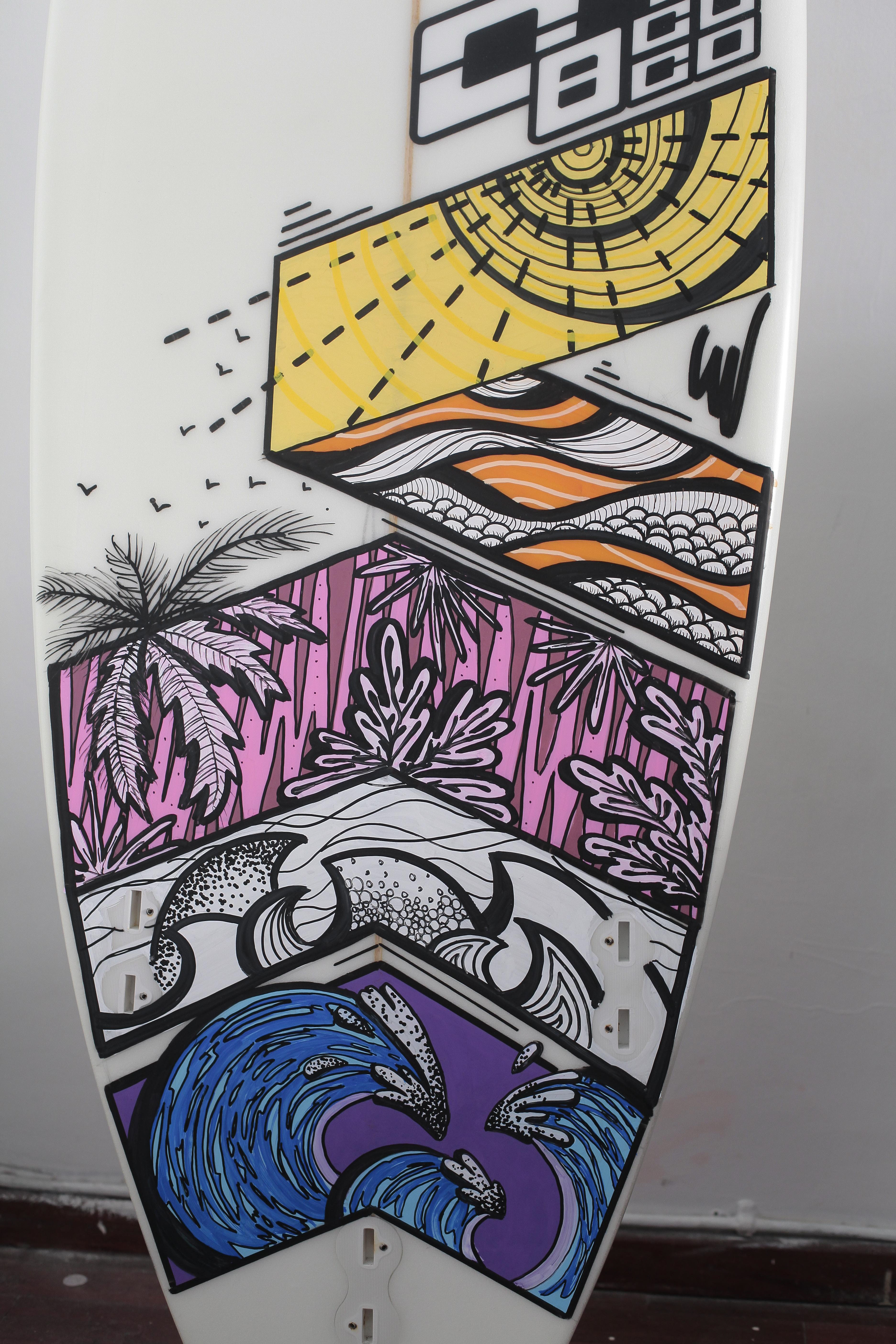 Illustration by order for this surfboard's owner, fanatic surfer and friend of the sea. It was a free design, with no pre sketching, just following the request that it had to be colourful.