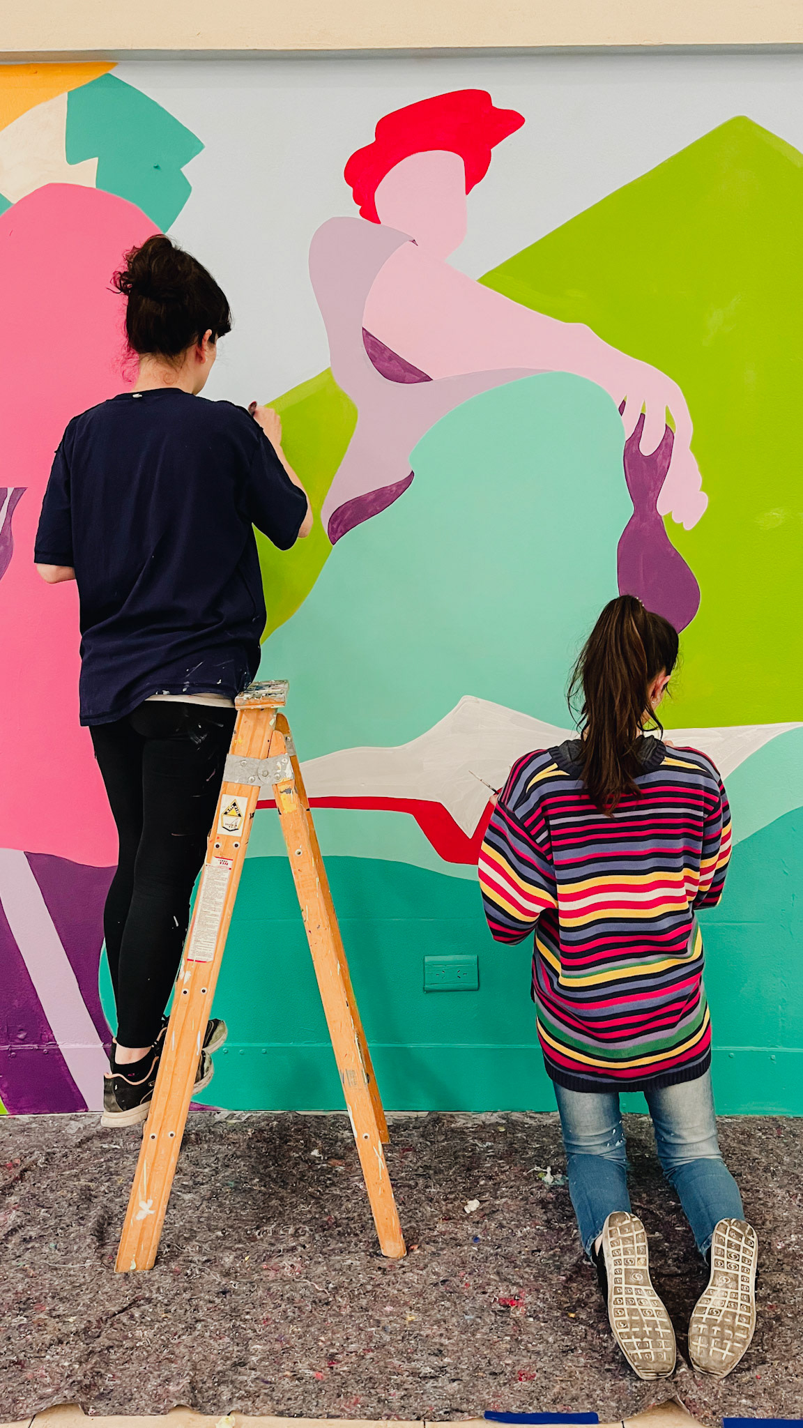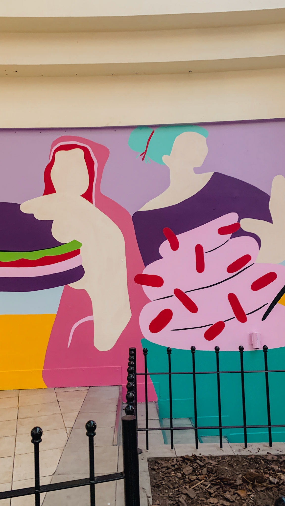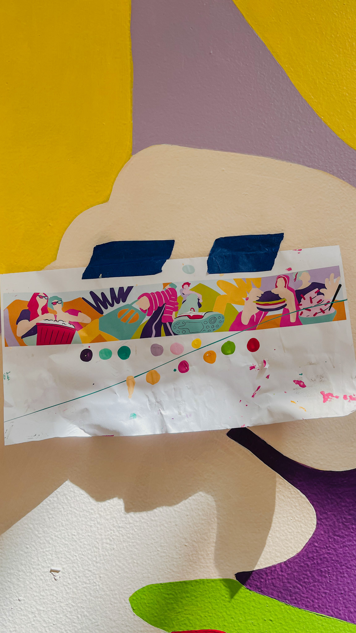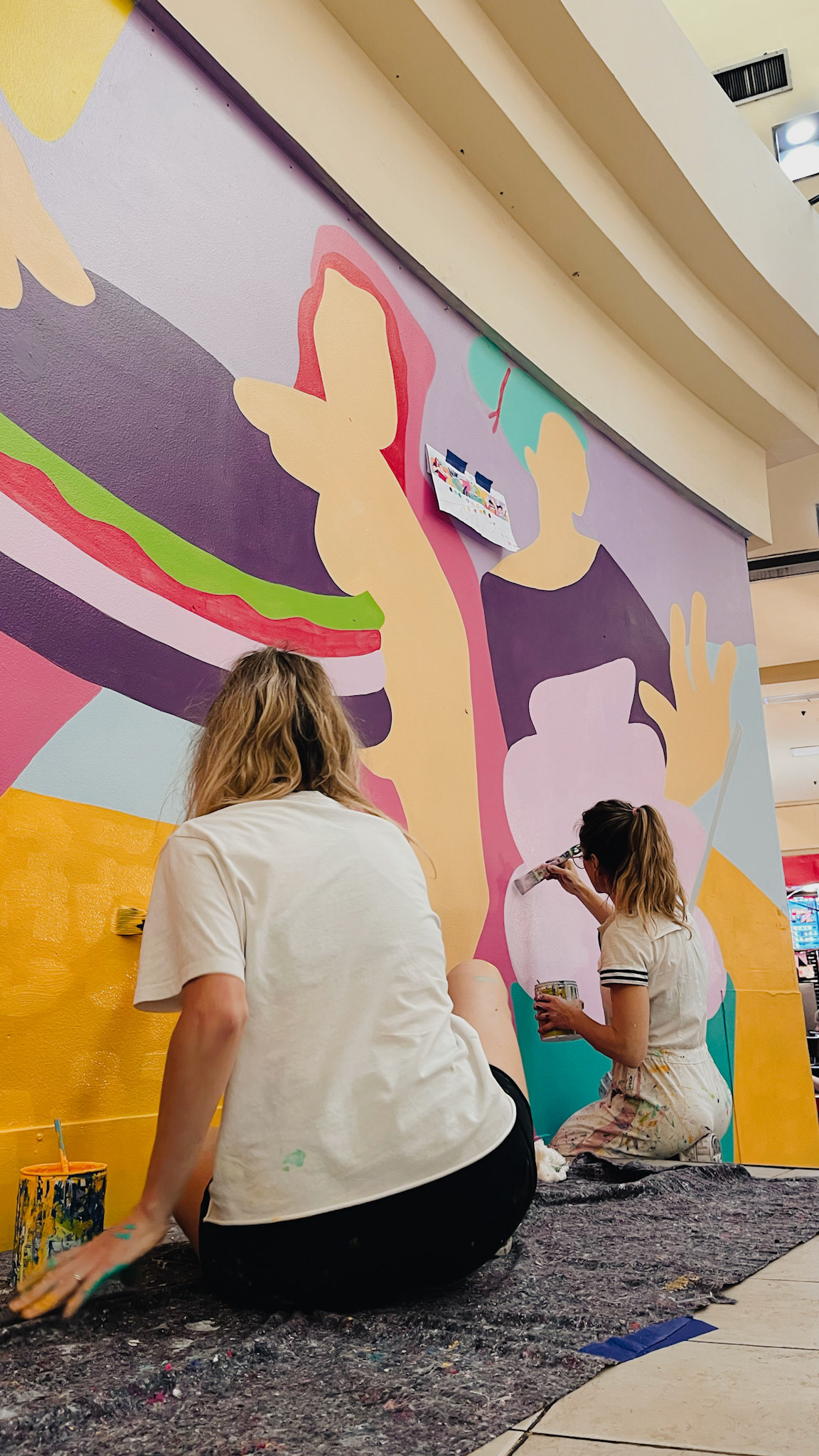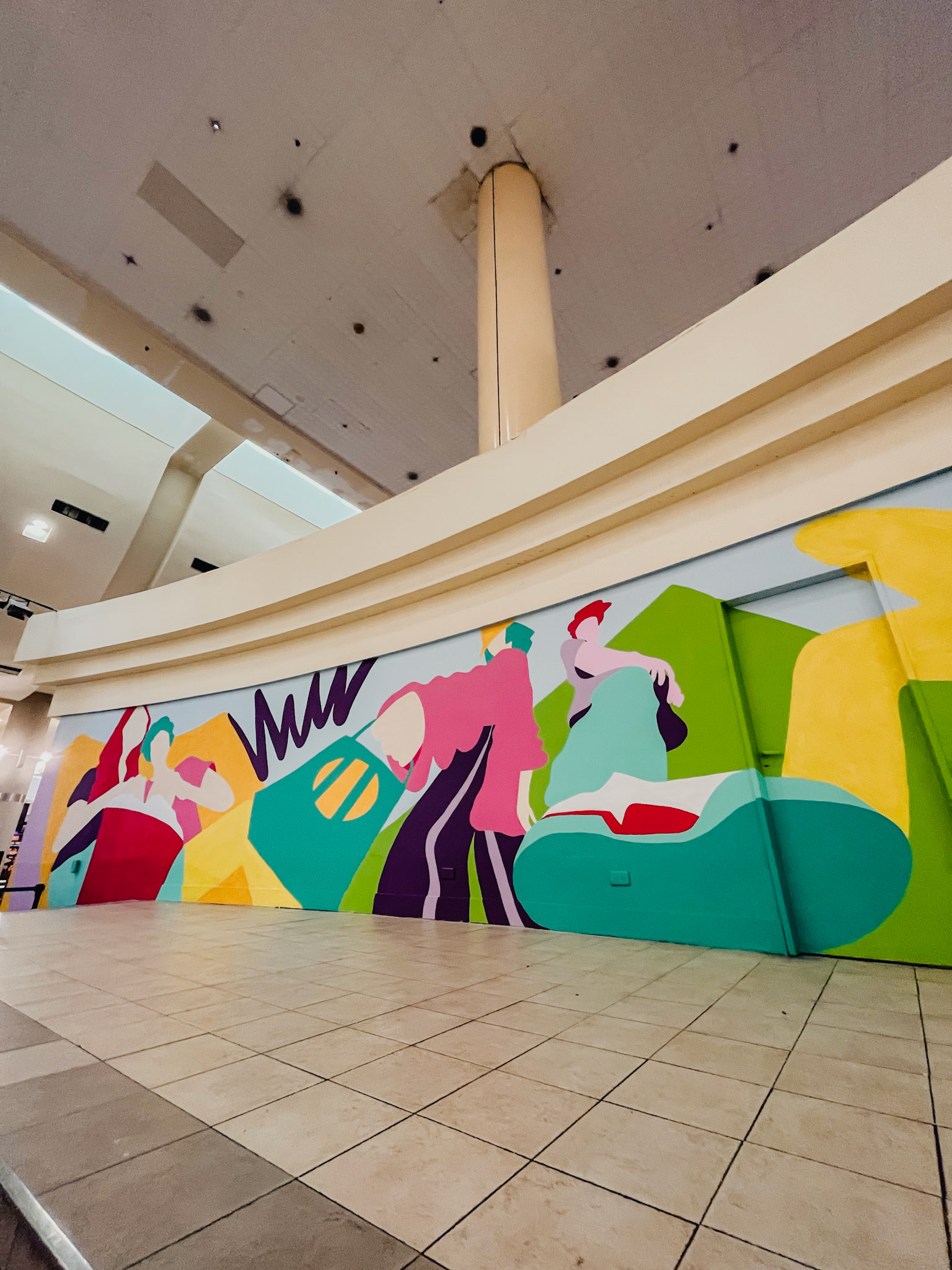 Mural específicamente diseñado para el patio de comidas del shopping. El requisito principal era que fuesen representadas las actividades que suceden dentro de las instalaciones del predio